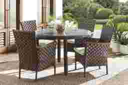 Laughter lingers, conversations flow and togetherness thrives within the Mantra collection's lavish and inviting embrace. Powder-coated aluminum frames wrapped in all-weather wicker bring rich brown color and irresistible tropical style. A round lay-on glass tabletop provides a stable surface for drinks and dishes and a view of the unique wide weave design beneath. Four side chairs feature generous arms and elongated seat backs to invite relaxation and indulgence long after the meal is over. Outdoor cushions in ash gray performance fabric provide an ideal final touch, UV-resistant for rich color and durability.
