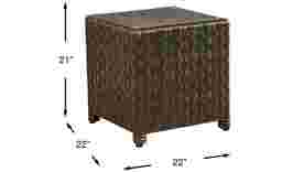 Laughter lingers, conversations flow and togetherness thrives around the Mantra end table's lavish and inviting looks. A powder-coated aluminum frame wrapped in all-weather wicker brings rich brown color and irresistible tropical style in a unique wide weave design. A glass top provides a stable surface for drinks, decorations or other patio essentials.