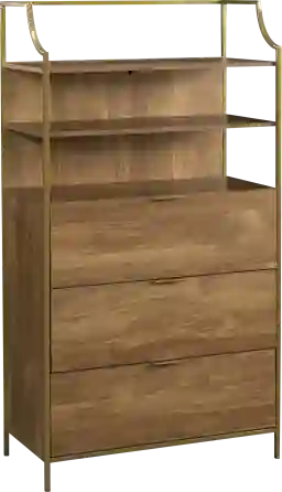 The Maplewell brown chest has three drawers that feature metal runners, and safety stops for smooth and easy access. Interlocking safety mechanism allows only one drawer to open at a time. Tip restraint safety strap included. Open shelving provides additional storage. Customer assembly is required.