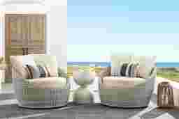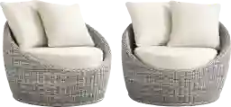 A soothing stillness and easy sense of escape wrap the Maraluna collection with an energy of restful grace that whispers the promise of a tranquil retreat. Casual contemporary design meets tropical woven wicker, balanced by gently curved frames and tailored proportions. Two swivel chairs in a gray finish and their plush cushions in beige create effortless comfort with outdoor durability, inviting long conversations or quiet moments under open skies.