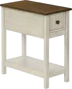 The Marblesys white nightstand is a must-have piece for your home. With a space-saving design, this 2-tier nightstand is perfect for small spaces with its narrow profile to be set next to an armchair or sofa in a living room with a small lamp or decorative objects on the easy to clean top, or as a charming nightstand in the bedroom. This two-tone table with an espresso brown veneer top and antique white veneer finish with sturdy straight solid wood legs brings some warmth to a space. The storage drawer on easy metal glides is accented with a bronze metal knob and the roomy bottom shelf allows you to conveniently keep essentials organized and within reach. Easy to assemble with illustrated instructions, all hardware and floor protectors included. Customer assembly is required.