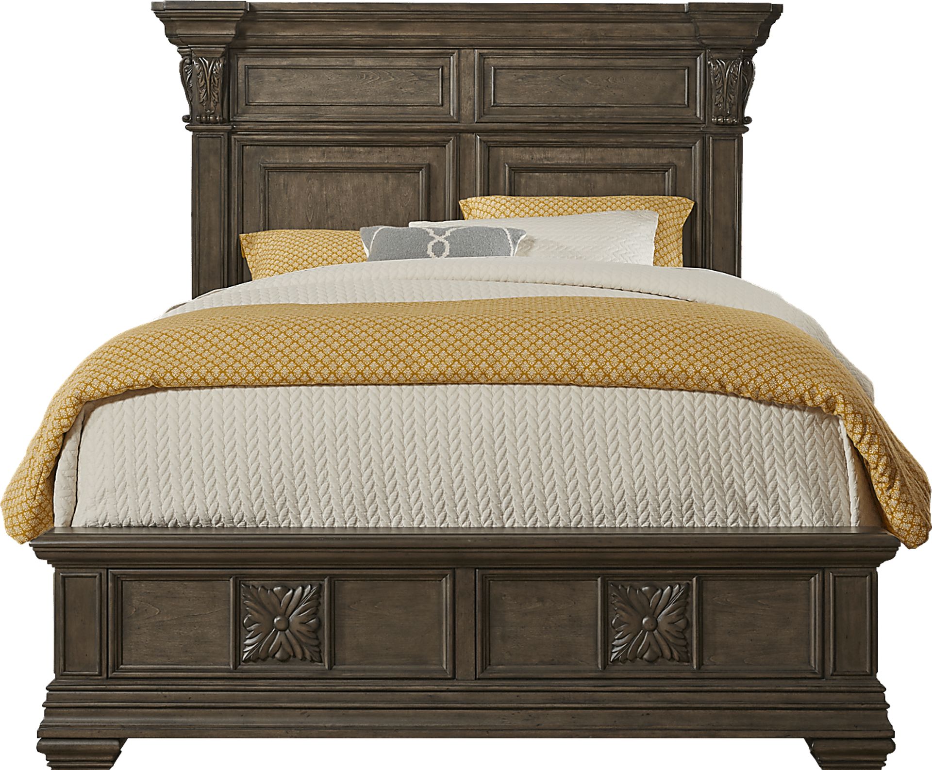 For a classic bed with designer impact, the Marcelle bed makes an excellent choice. This elegant panel bed boasts Architectural style columns and chic moulding details. Made with poplar solids and birch veneers in a warm brown finish, the bed features a tall headboard balanced by a low footboard. Reversible rails allow you to raise or lower the height of your mattress. Mattress and foundation (if required) sold separately.