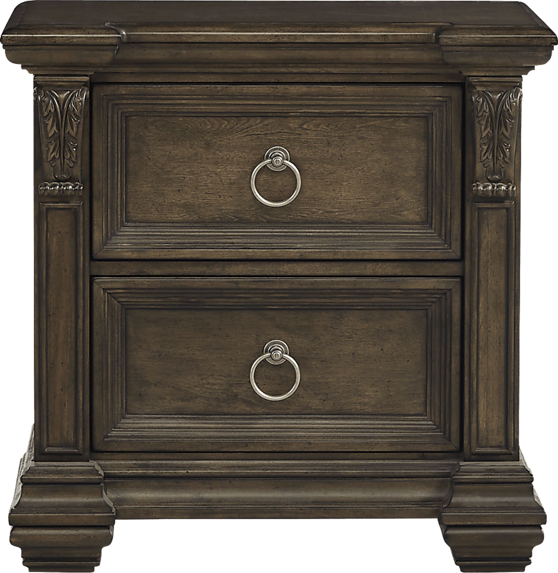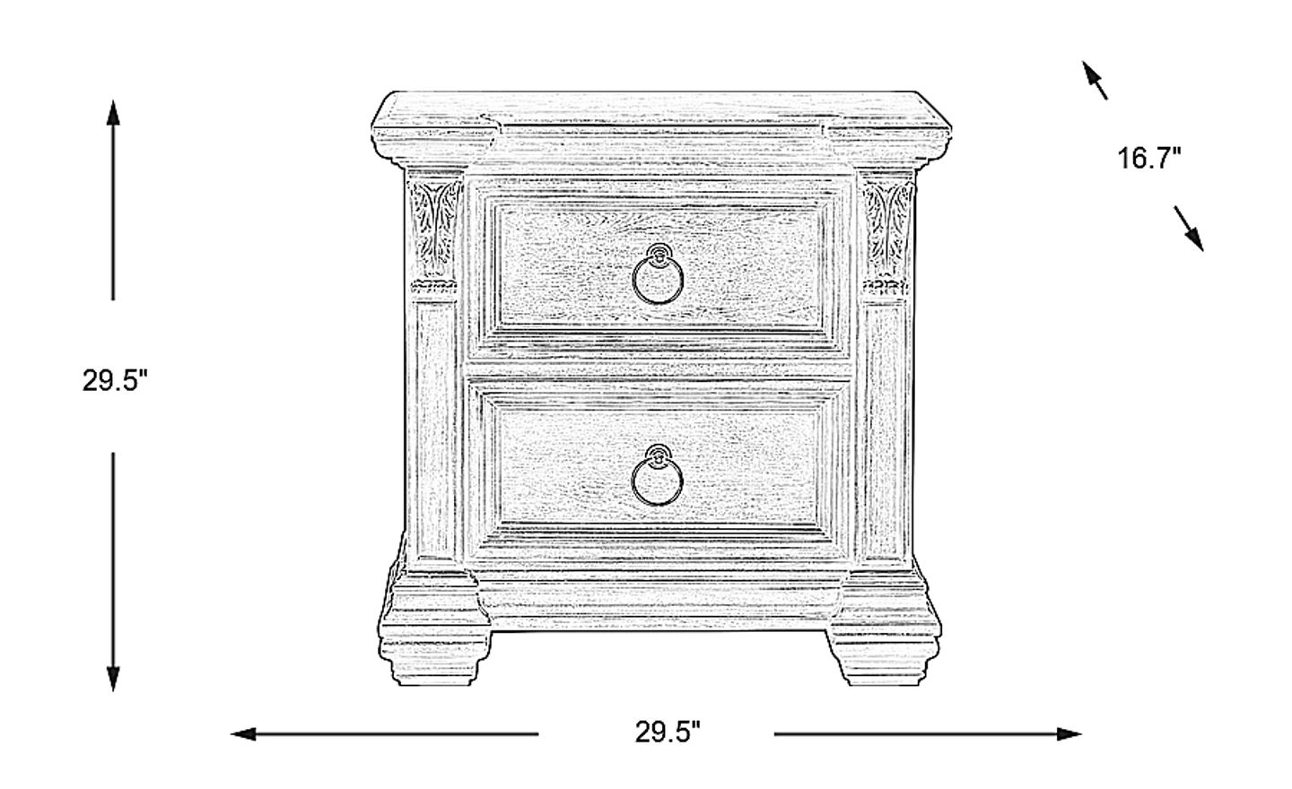The Marcelle nightstand is a traditional choice with beautiful details. It boasts striking carved effects and picture frame moulding. Two spacious drawers, made with English and French dovetail joints, are ideal for keeping evening essentials close at hand. The nightstand is crafted with wood solids and birch veneers. Pewter finished metal drawer pulls offer a nice contrast to the nightstand's rich brown finish.