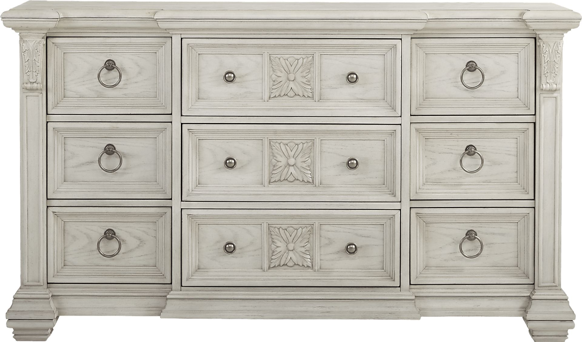 Viewed from any angle, the Marcelle dresser is an eye pleasing storage solution. It features nine drawers made with sturdy English and French dovetail joints for strength and durability. The dresser is crafted with poplar solids and birch veneers in a lovely white finish. Carved effects, picture frame moulding and Architectural-inspired elements add interest.