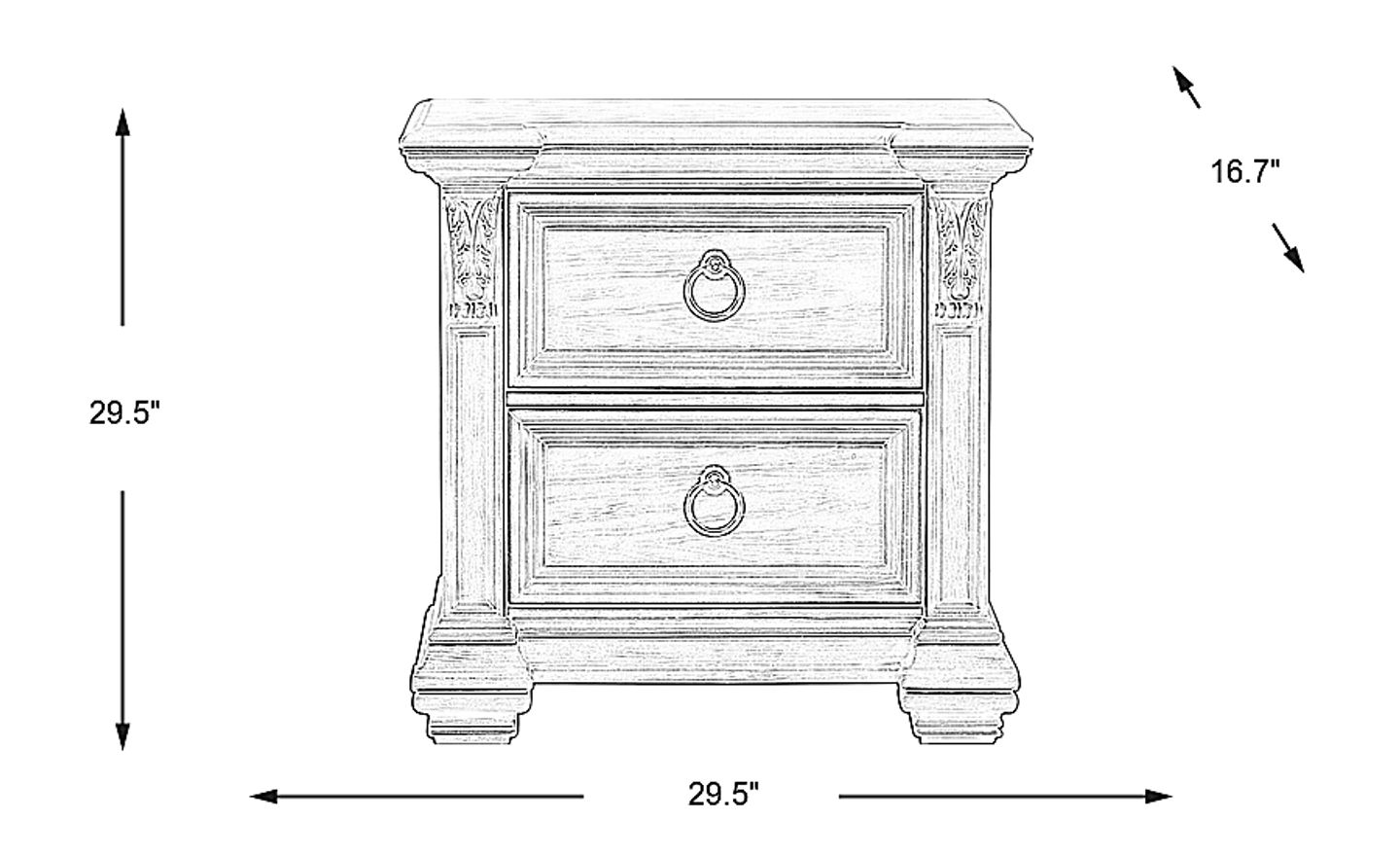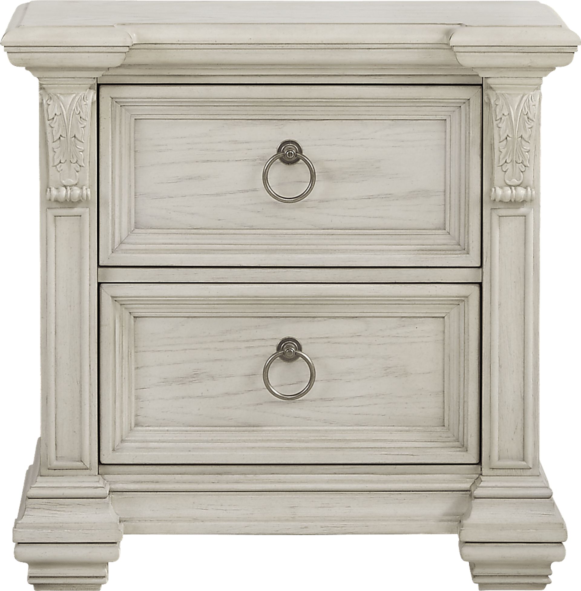 The Marcelle nightstand is a traditional choice with beautiful details. It boasts striking carved effects and picture frame moulding. Two spacious drawers, made with English and French dovetail joints, are ideal for keeping evening essentials close at hand. The nightstand is crafted with wood solids and birch veneers. Pewter finished metal drawer pulls offer a nice contrast to the nightstand's white finish.