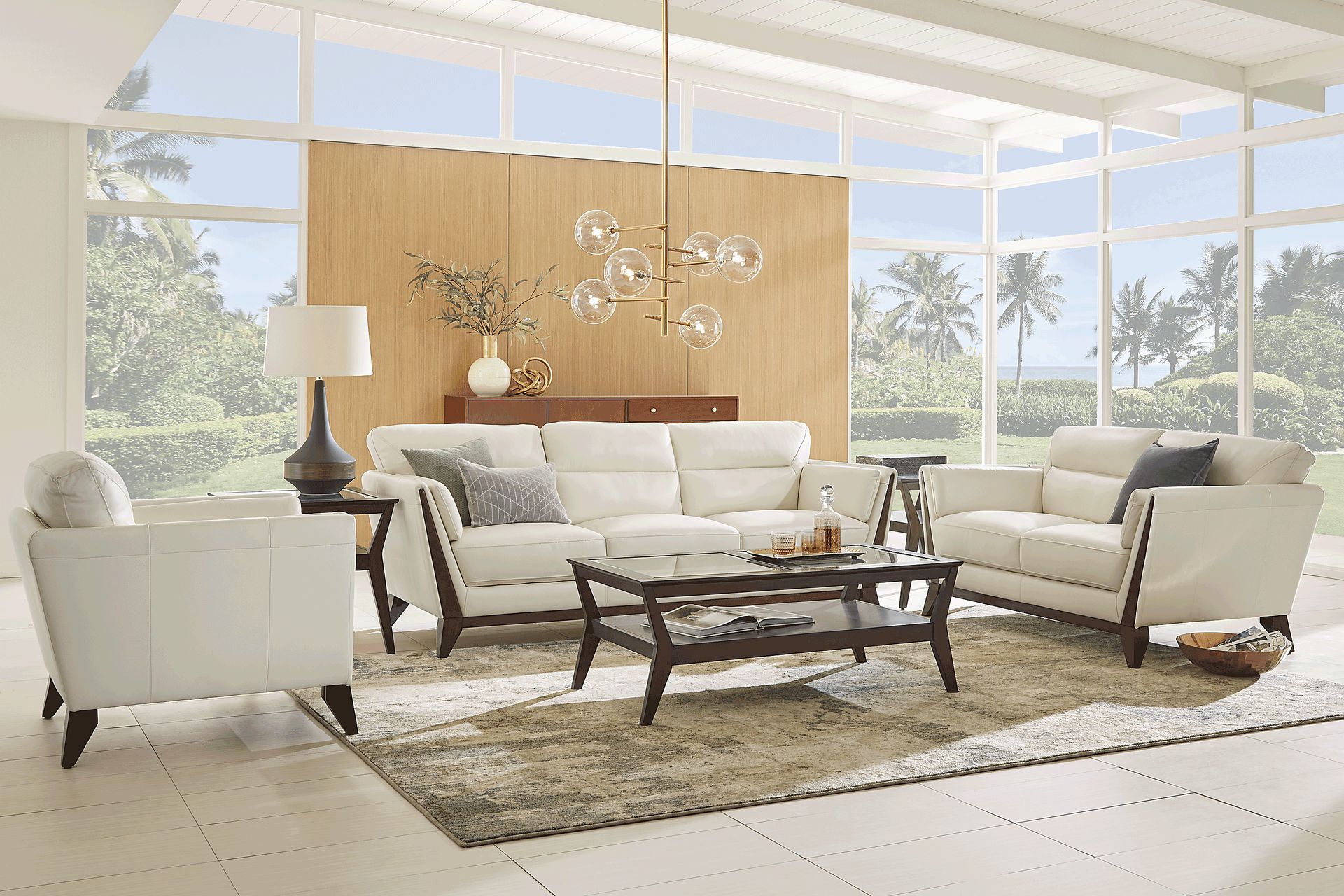 The Marchese sofa brings a stylish flair worthy of any decorator's showroom. Its sleek silhouette and beautiful brown cherry finished wood trim makes it a great choice for a contemporary living space. Wedge arms with interior cushions and tapered angled legs add architectural style. Upholstered with top grain leather where the body touches in a neutral off-white color, the sofa is as comfortable as it is chic. Upholstery: Top grain leather where the body touches and vinyl sides and backs.