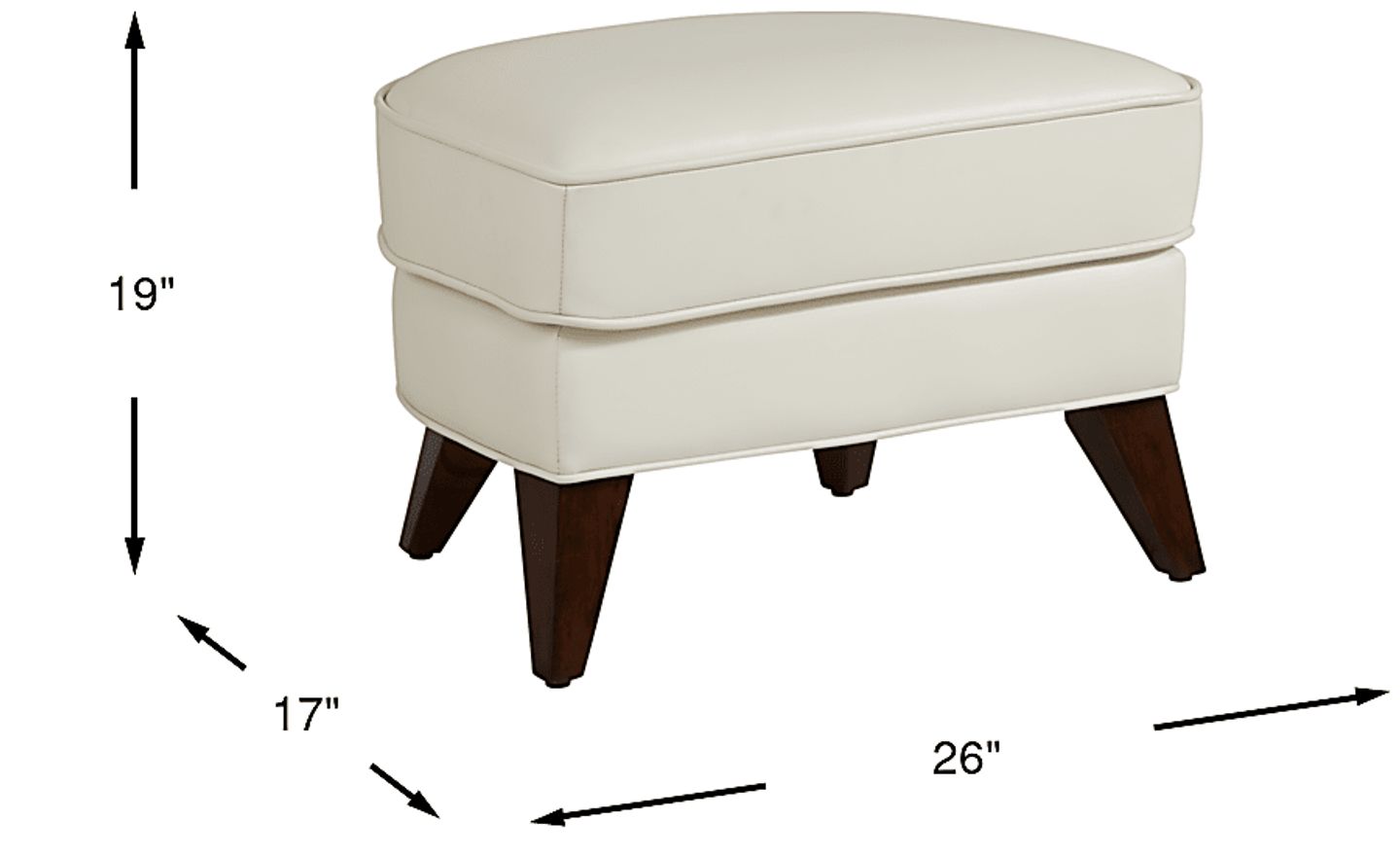 An ideal companion for its matching chair, the Marchese accent ottoman offers a stylish place for feet or use as an extra seat. It boasts off-white colored top grain leather where the body touches and welted seams. Angled tapered legs provide support with contemporary flair. Upholstery: Top grain leather where the body touches and vinyl sides and backs.