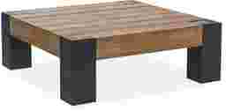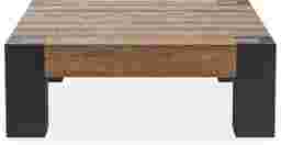 Light catches the tabletop's grain and warm tones settle into the room as the Marco table collection's inviting texture and structural form come to life. Rooted in modern style, this cocktail table adds a cozy and organic charm to any room. The plank-inspired top crafted from pine veneers in a rich, natural brown finish boasts intricate wood-like detailing, bringing a touch of nature indoors. Square black legs peek through each corner, highlighting the table's clean-lined silhouette and bold contrast.