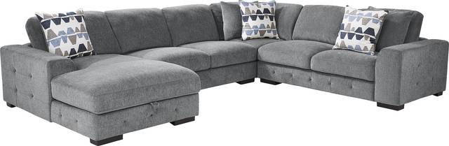Create a lively space with the Marcola sectional. Upholstered in soft woven fabric, this piece comes in an ash gray color. Contemporary in style, the sectional includes a fold-out sleeper and a storage compartment in the chaise, giving you plenty of room for guests and extra blankets, pillows and more. Sleek track arms and tufted detailing add to the stylish appearance, while matching accent pillows bring a bit of color. Upholstery: 100% Polyester.