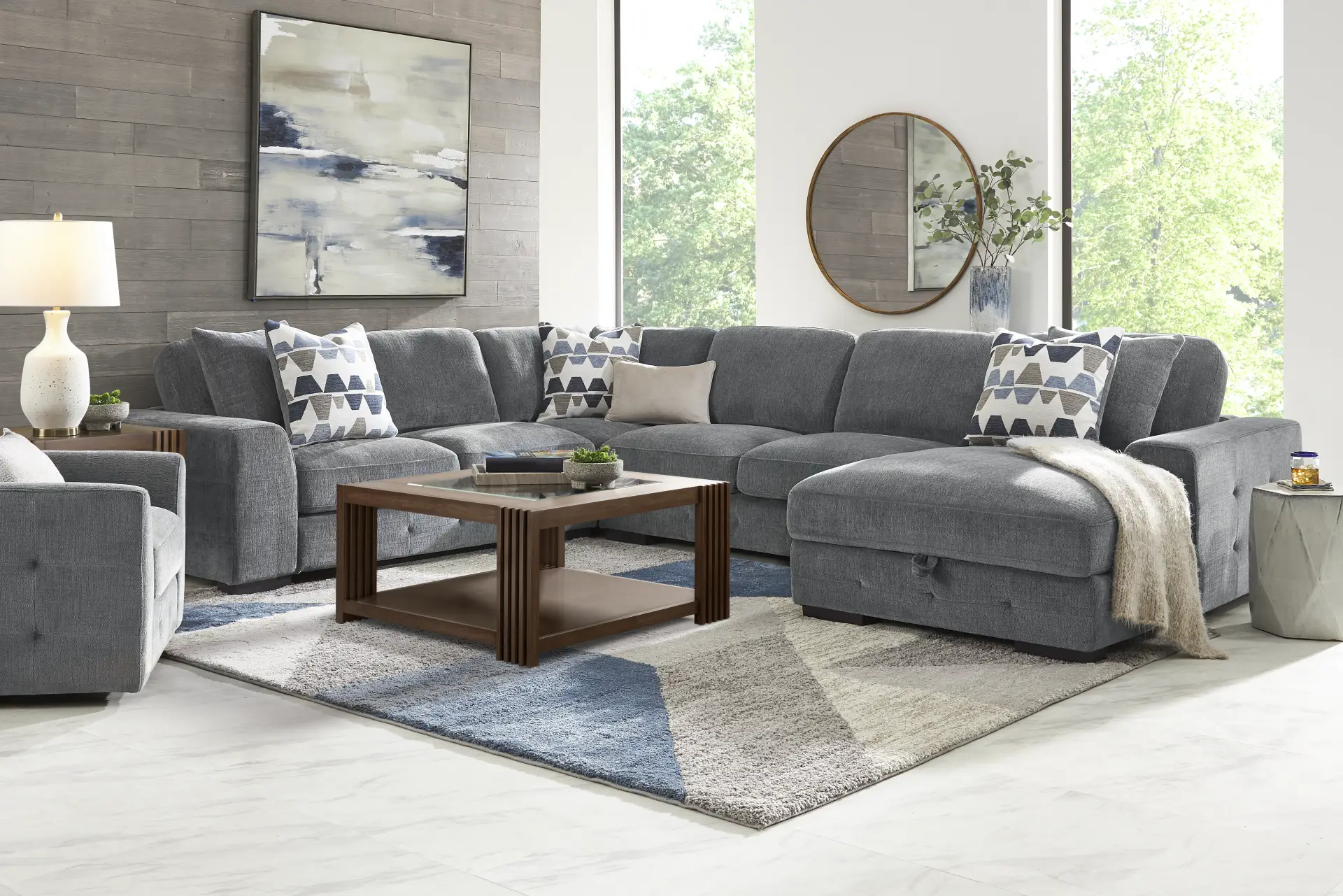 A storage chaise adds thoughtful function, offering a hidden place for blankets, pillows, and everyday essentials while keeping the look clean, composed, and ready for living.