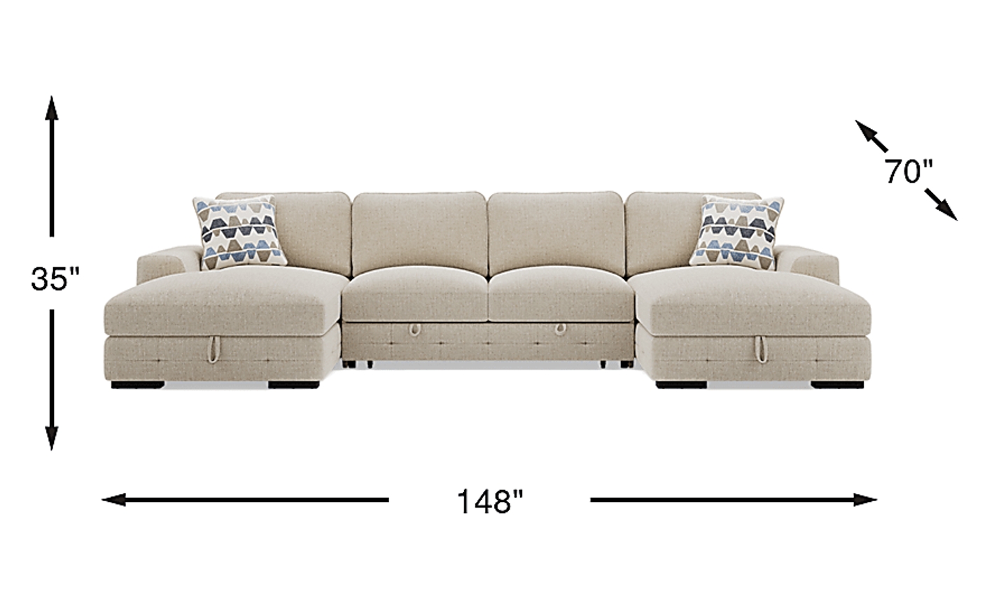Because this is a substantial 148-inch wide piece, it is vital to measure more than just your living room footprint. Ensure you have a clear path through front doors, hallways, and any stairwells. The chaises are 70 inches deep, so you will need a minimum clearance of 35 inches (the height of the frame) to maneuver the individual pieces through standard entryways during our full-service delivery process.