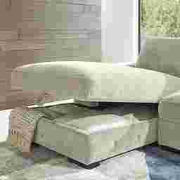 The integrated storage chaise is a highly functional feature designed to maximize your living space. It provides a discrete, hidden compartment perfect for stowing away seasonal items like heavy blankets, extra pillows, or media accessories. This is particularly useful for maintaining a clean, contemporary aesthetic in your home by reducing visible clutter while keeping your essentials within easy reach for movie nights or guest hosting.