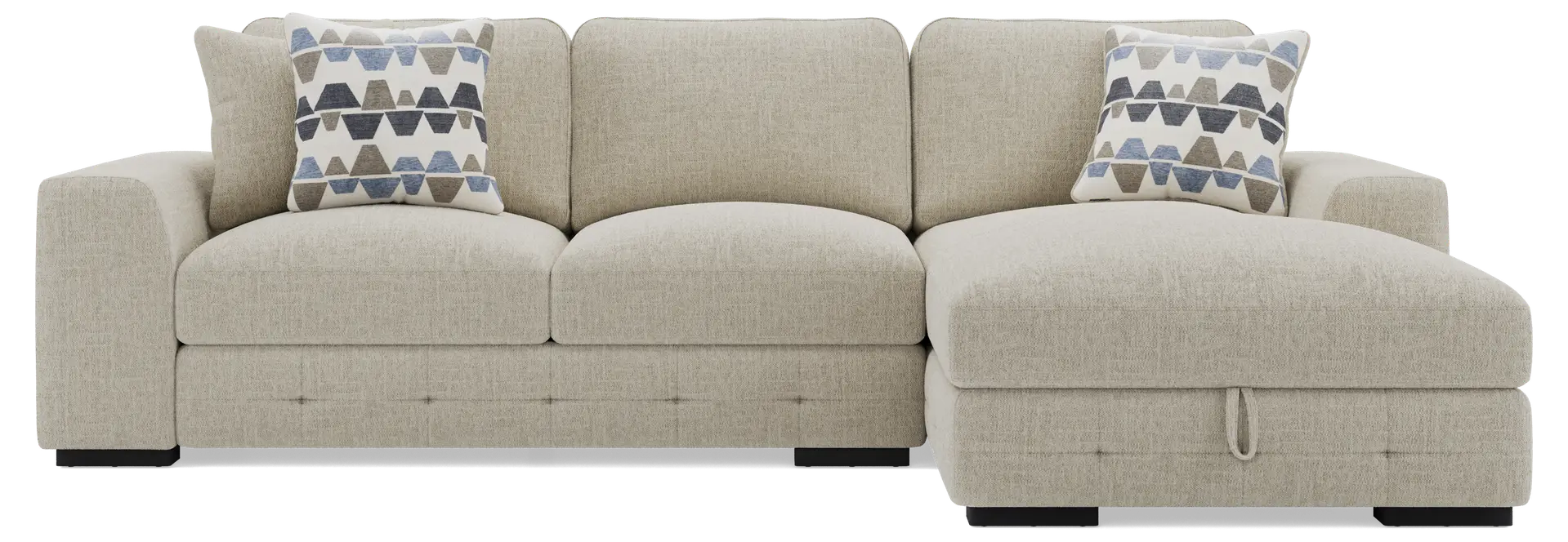 This sectional is designed for maximum functionality in shared living spaces. It features a built-in storage chaise that easily lifts to reveal a hidden compartment. This is an ideal solution for storing extra blankets, pillows, and linens, allowing you to keep your living room organized while ensuring guest essentials are always within reach.