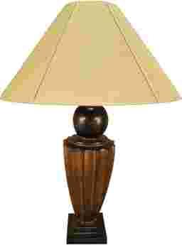 The attractive Maria lamp is made of hydrocal stone and features a shapely fluted base topped by a decorative accent ball. Its timeless antique copper finish has burnished ebony accents. A beautiful silk shade is a lovely champagne color tops it off.