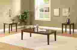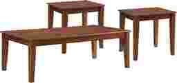 The Marilla brown cherry 3 pc table set is a perfect design to freshen up a dated living room. Skillfully scaled, the Marilla 3 piece table set features a proportional apron and tapered leg to the bull nose top. This set is finished in brown cherry and scaled to accent a room and not take up too much space. Set comes with 1 cocktail table and 2 end tables. Some customer assembly required.