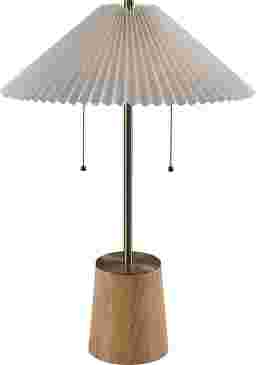 Introducing the Marjorie Way Brass Lamp, a stylish fusion of natural and refined elements. Featuring a chunky natural wood base and a slim antique brass pole, this lamp offers a perfect balance of rustic charm and modern sophistication. The tapered white pleated fabric shade adds a touch of elegance, creating soft and ambient lighting. Standing at 27 inches tall, it's an ideal accent piece for bedside tables, desks, or living room side tables. Partial assembly may be required.