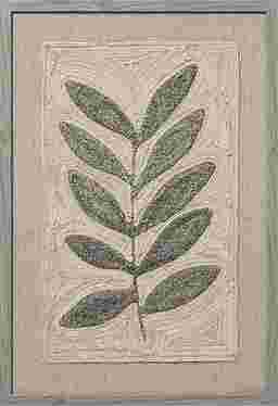 Marka is a handmade wall art piece with a grey-and-ivory botanical design, a wonderfully textural accent for bohemian or natural home decor. The artwork is crafted from wool measuring 26" x 38". Each piece is custom-framed, so dimensions may vary slightly (up to 1").