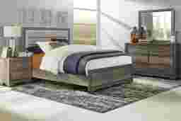 Clean lines, an on-trend weathered gray finish and upholstered elements create a chic bedroom retreat with the transitional Marlow collection. The panel bed, with crisp, straight lines, features a padded upholstered headboard. Coordinating items have bar shaped hardware in a brushed nickel finish. Mattress and foundation (if required) sold separately. Bed shown is queen size.