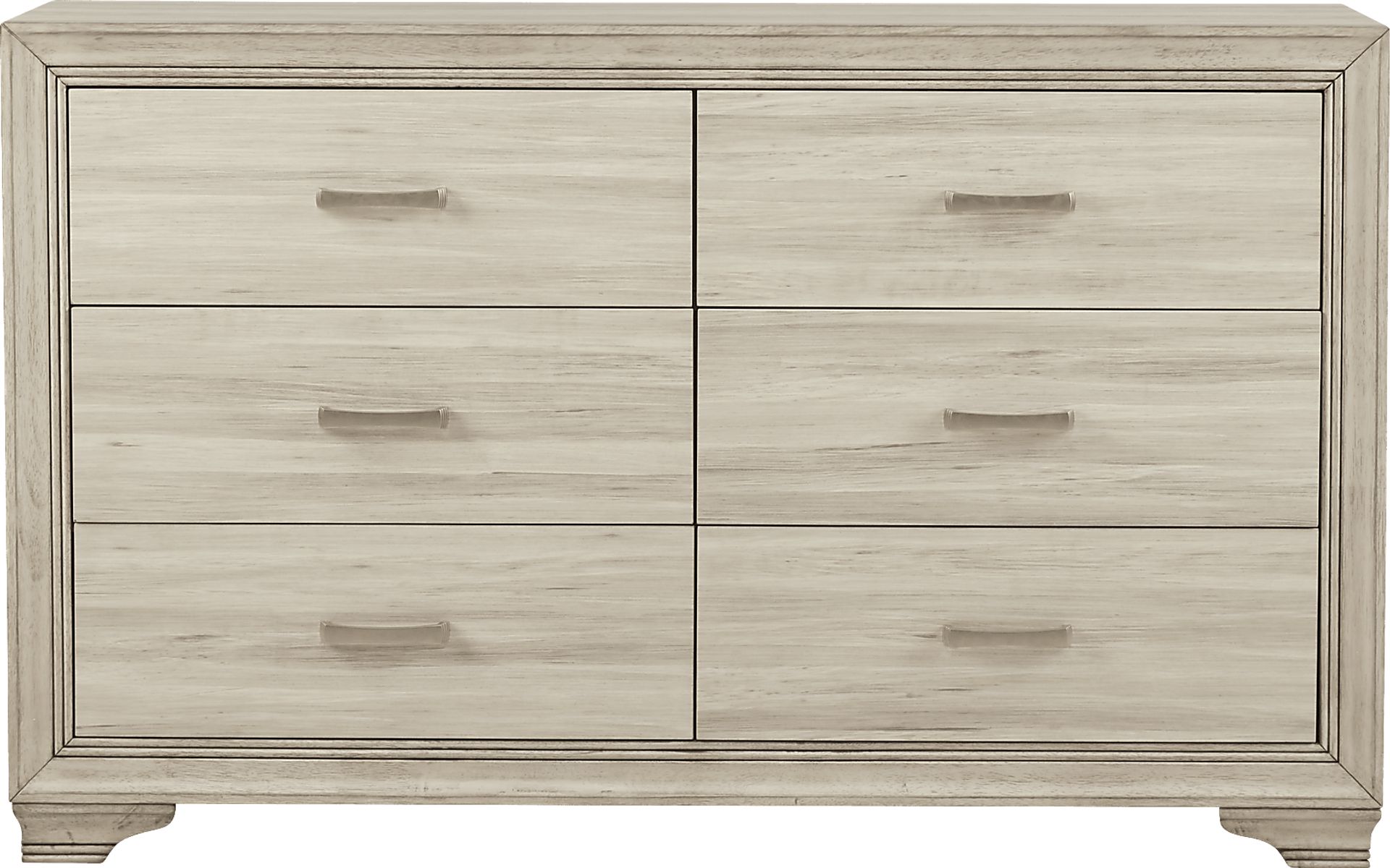The dresser arrives with premium brushed nickel bar-shaped hardware already installed. The cool, metallic tone of the brushed nickel provides a sophisticated, contemporary contrast to the warm, natural wood grain, making it versatile enough to transition between casual, coastal, and modern decor styles.
