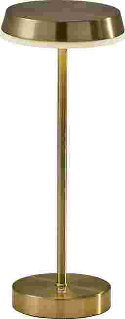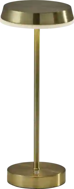 Introducing the Marlowe Valley Brass Lamp, a versatile lighting solution designed for both indoor and outdoor use. With its antique brass finish and sleek slim disc shade, this lamp combines style with functionality. Standing at a height of 15 inches, it's perfect for tabletops, desks, or outdoor entertaining areas. Equipped with a convenient 3 level touch dimmer switch, you can easily adjust the brightness to create the perfect ambiance. Powered by a rechargeable LED, it provides long-lasting illumination without the need for cords. Plus, with its IPX4 location rating, you can confidently use it outdoors, even in damp conditions. Partial assembly may be required.