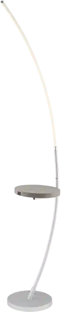 Combine two-in-one innovation with expert craftsmanship in the Morona LED Arch floor lamp with built-in wireless charging & USB tray table for your home. It features a metallic silver finish over metal construction, topped by an aluminum and acrylic diffuser, but the prominent feature is its sleek, curved, wispy-thin silhouette. Functional tray table in trendy gray wash wood finish includes a built-in QI wireless charging pad and USB port, allowing you to fast charge compatible smart phones or other electronic devices with ease. One touch switch located on pole provides 4-way dimming lighting control. It's an eye-catching design that looks great in a modern living space or a home entertainment room. Partial assembly may be required.