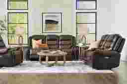YOU SAVE $33497Includes:brown triple power reclining sofa • brown reclining loveseat • Nested Table + 2 End Tables