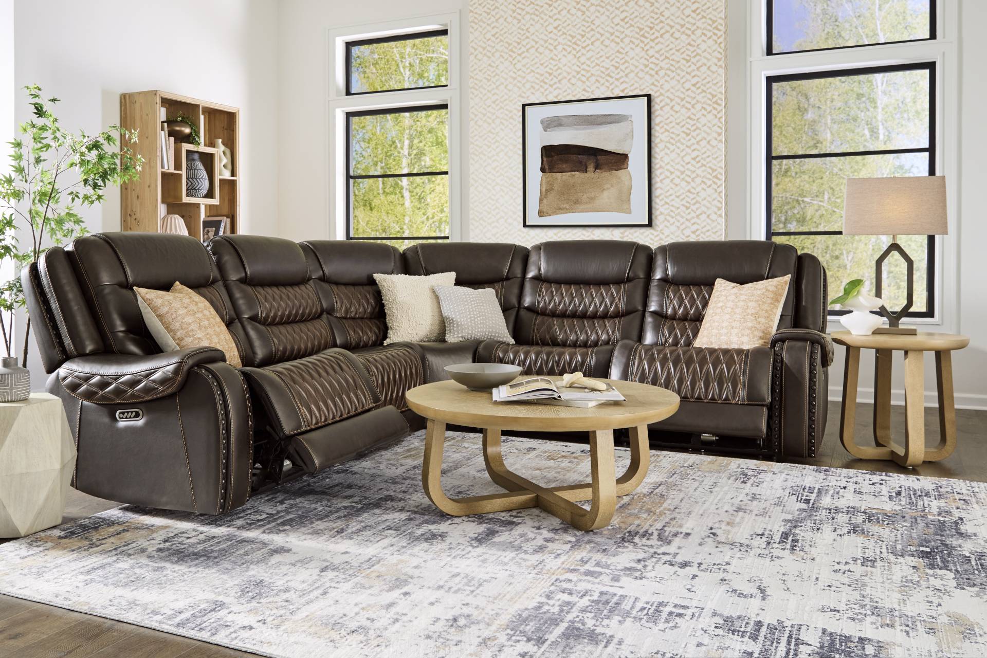 Intimate gatherings and festive occasions become more comfortable and sophisticated with the Drew and Jonathan Marquee collection, created to elevate great times with its sumptuous curves, striking details, and packed premium features. This traditional sectional showcases supple, deep brown top grain leather where the body touches and plush attached seat and back cushions for ultimate support. Contrasting top-stitched seams throughout the collection add a stylish flair, while contrasting welt and quilting details across the backs, seats, and pad-over arms create textural elegance. Triple power reclining offers adjustable headrests, footrests, and lumbar support as well as a zero-gravity mechanism for a weightless reclining experience. Additional features like hidden cupholders and USB charging on control panels elevate the experience for luxurious lounging. Upholstery: Top grain leather where the body touches and polyurethane fabric sides and backs. Leather is a durable, low maintenance product, however, general regular maintenance is necessary. To keep your leather clean, vacuum it regularly, removing any dust, and clean it with water and a mild non-detergent soap.