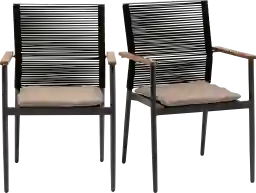 Sharply accented with teak wood armrests, the Marsalise black armchair, set of 2 adds a modern silhouette to any space. Cleverly designed with style and comfort in mind, it is perfect for achieving a contemporary look indoors or outdoors.