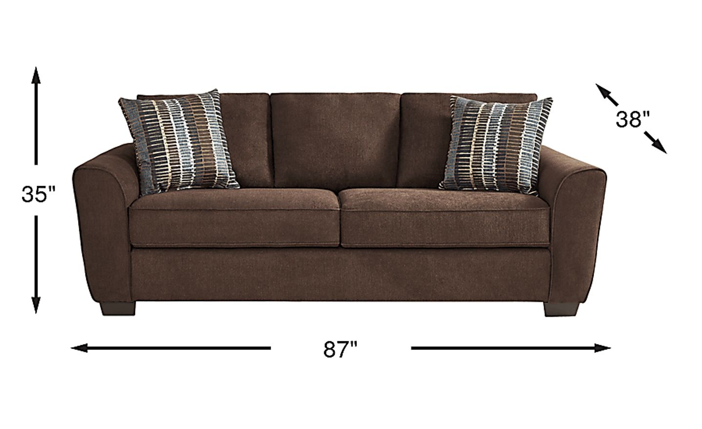 Creating the ideal atmosphere for a cozy retreat, the Marshall sofa offers a calming blend of rich tones and elegant appeal. Soft brown upholstery encases deep, plush cushions that welcome you to unwind. The supportive wedge arms and large tapered block legs add to the sophistication of this traditional design, elevating your lounging experience. Included accent pillows add extra comfort and a touch of coordinating style. Upholstery: 98% Polyester, 2% Nylon.