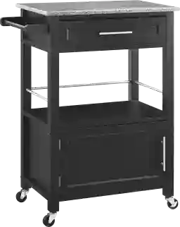 Perfect for adding extra storage and work space to a kitchen, the Marsuda kitchen cart is a versatile accent. A granite top adds durability and classic style to the cart. A spacious drawer, cabinet area and open shelf provides ample storage space for supplies and gadgets. Durable easy roll wheels allow you to easily move the piece wherever it is needed most. The black finish allows the cart to easily complement any homes furnishings. Customer assembly is required.