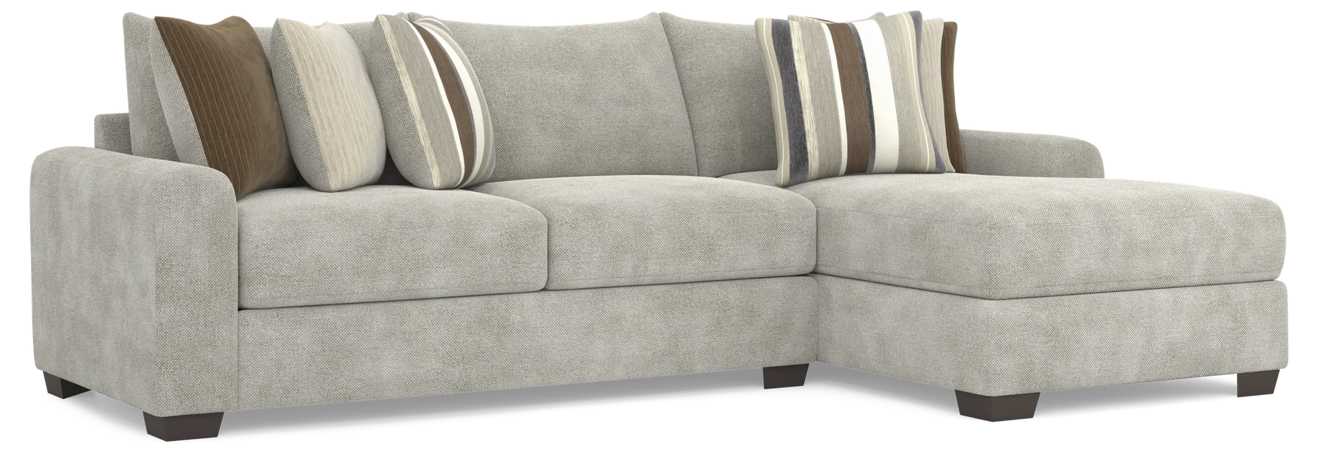 Laid back with a silhouette brimming with ease and tranquility, the Martin sectional creates an atmosphere perfect for lounging and unwinding with your favorite people. Upholstered in plush gray woven chenille, this contemporary collection features a chaise that takes relaxation to art form status. A padded frame and sophisticated track arms provide soothing comfort while loose, reversible seat and back cushions make finding your comfort zone easy and cleaning a snap. Toss pillows add color and depth as cylindrical legs in a warm brown finish provide the final, peaceful touch. Upholstery: 100% Polyester.