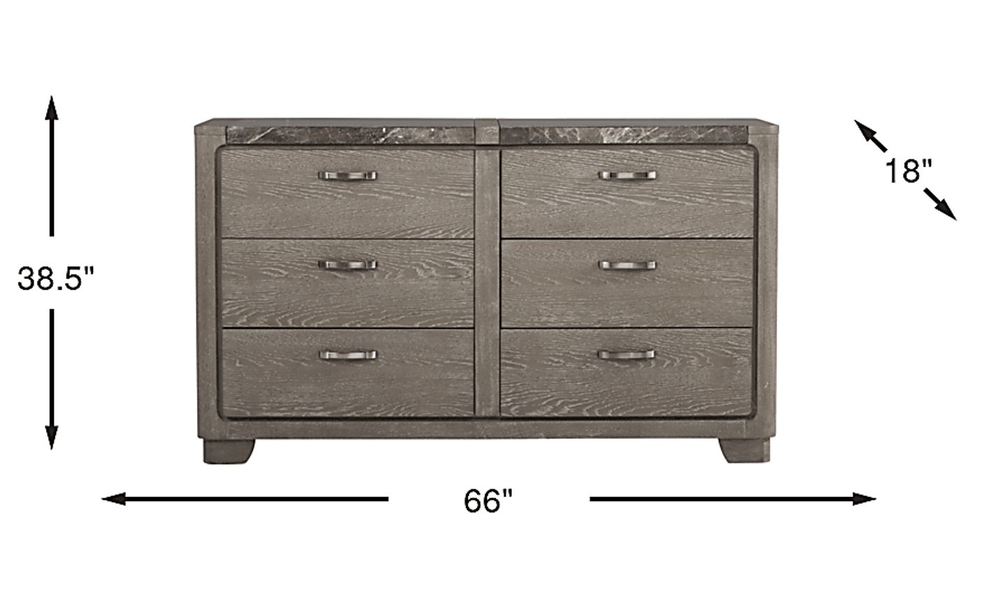 The Marvella dresser easily proves that storage can be stylish. This piece, with its luxurious marble top and rounded edges, features six spacious drawers. The dresser is crafted with wood solids and oak veneers. Each drawer is made with English and French dovetail joints for strength and stability. The brushed nickel bar shaped hardware adds the final touch while beautifully complementing the dresser's wire brushed gray finish.