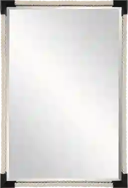This versatile Masco mirror features a thick, twisted, white cotton rope paired with matte black iron details for a modern coastal aesthetic. Mirror has a generous 1 1/4 bevel. May be hung horizontal or vertical. Customer assembly is required.