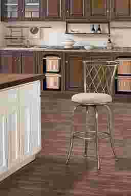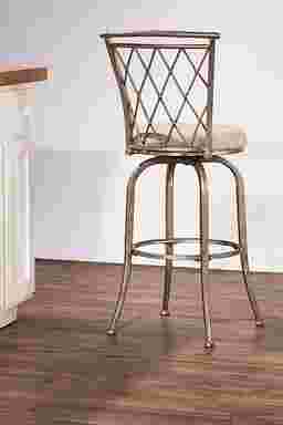 Featuring a graceful and classic lattice back, the Mastock stool extends traditional style and comfort to your kitchen or patio for indoor or outdoor entertaining. Boasting a heavy-duty steel frame, a beautifully rich champagne powder coated finish for extra durability and protection against harsh UV rays, a 360-degree swivel mechanism, weather resistant Sunbrella Cast Ash performance fabric, and a reticulated quick dry foam seat, this durable and attractive stool is ideal for your indoor and outdoor spaces. Some assembly required.