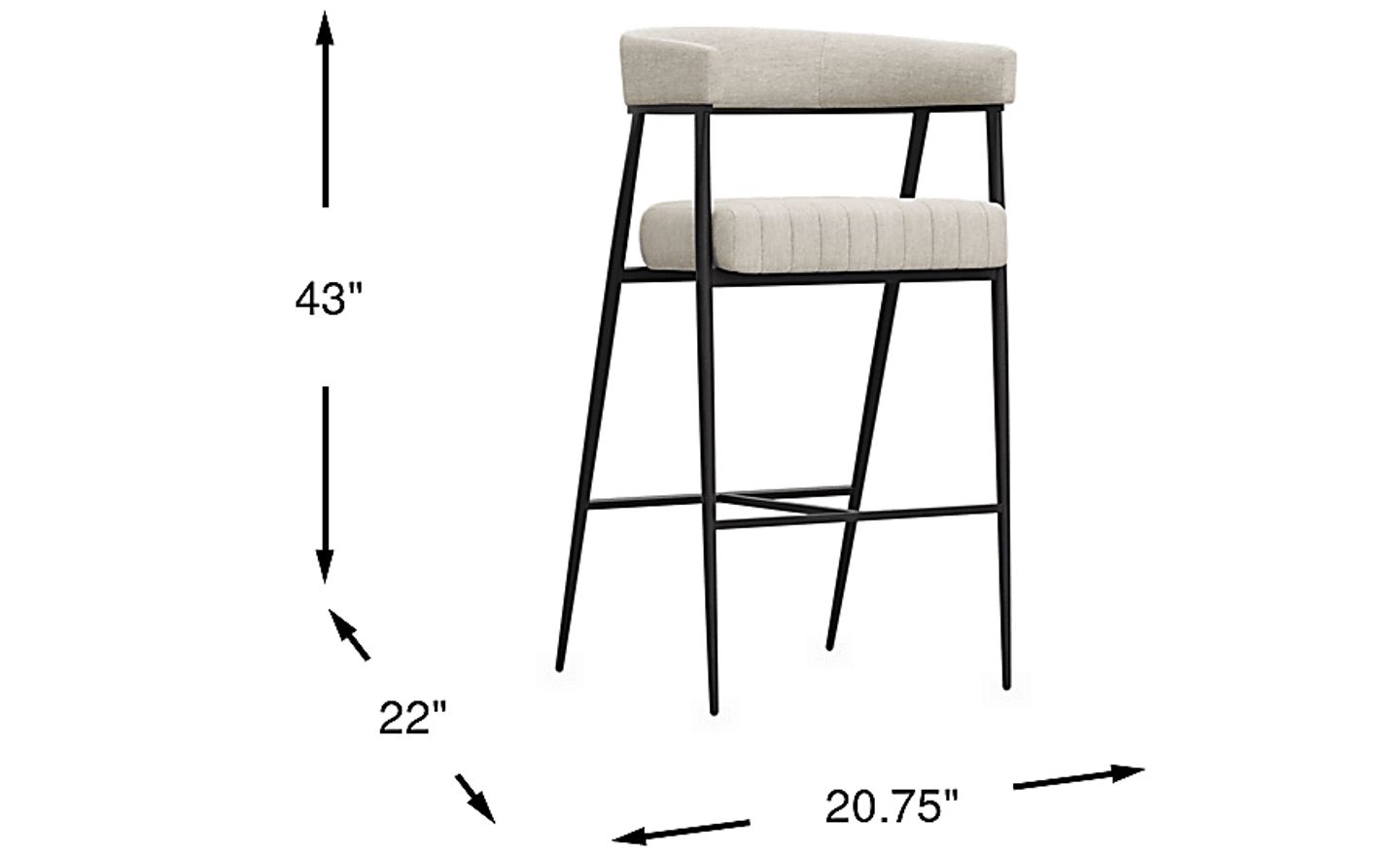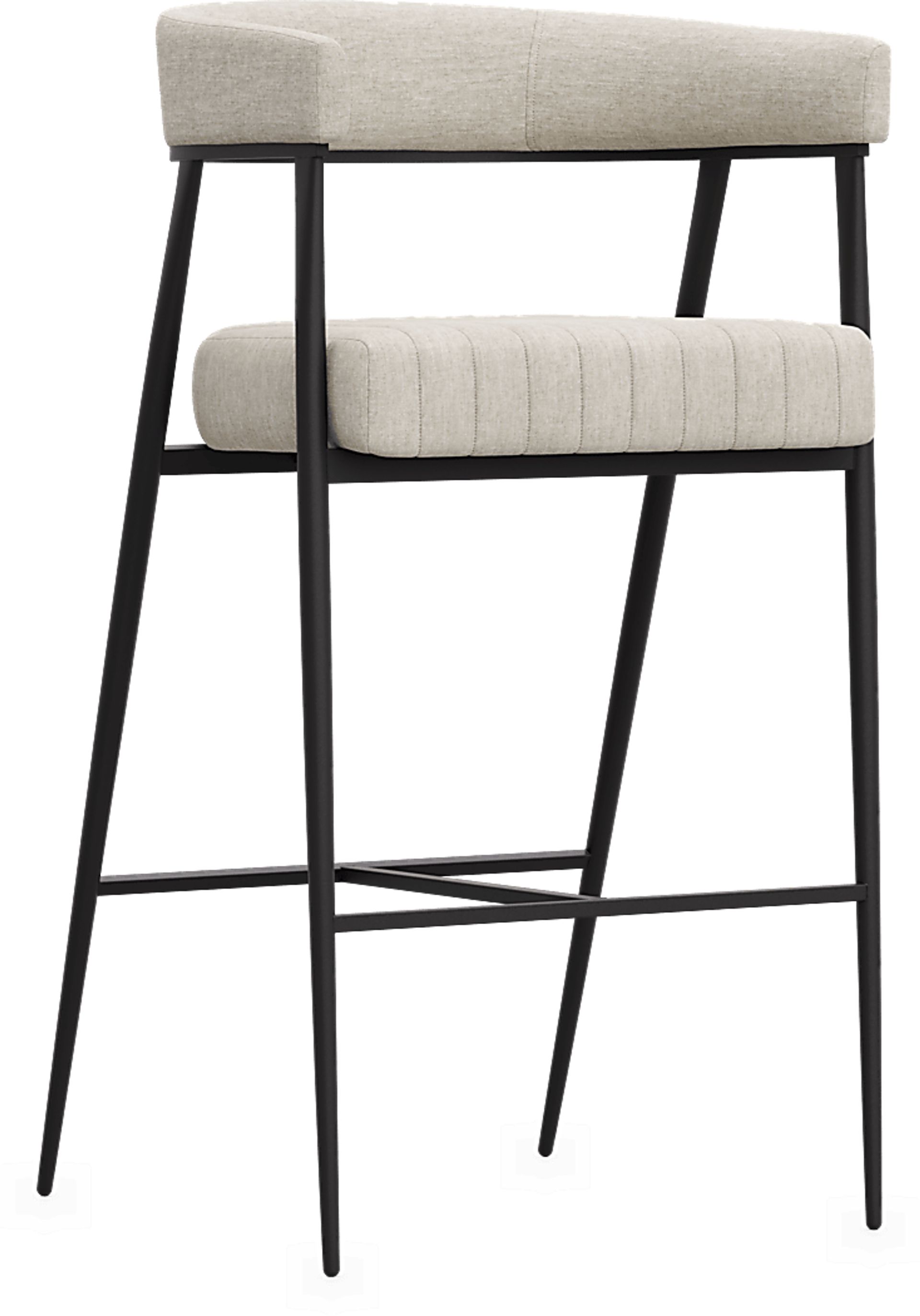 Leaning into cocktail-hour conversations or indulging in at-home relaxation, the Mathis stool is midcentury-inspired contemporary style rendered in graceful metal and soft cream-colored fabric. Four metal legs in black each taper to a point, held steady with stretchers that conveniently function as footrests. The upholstered seat features a wrap-around back and channeled details, providing a touch of softness for those conversations that run long into the night.