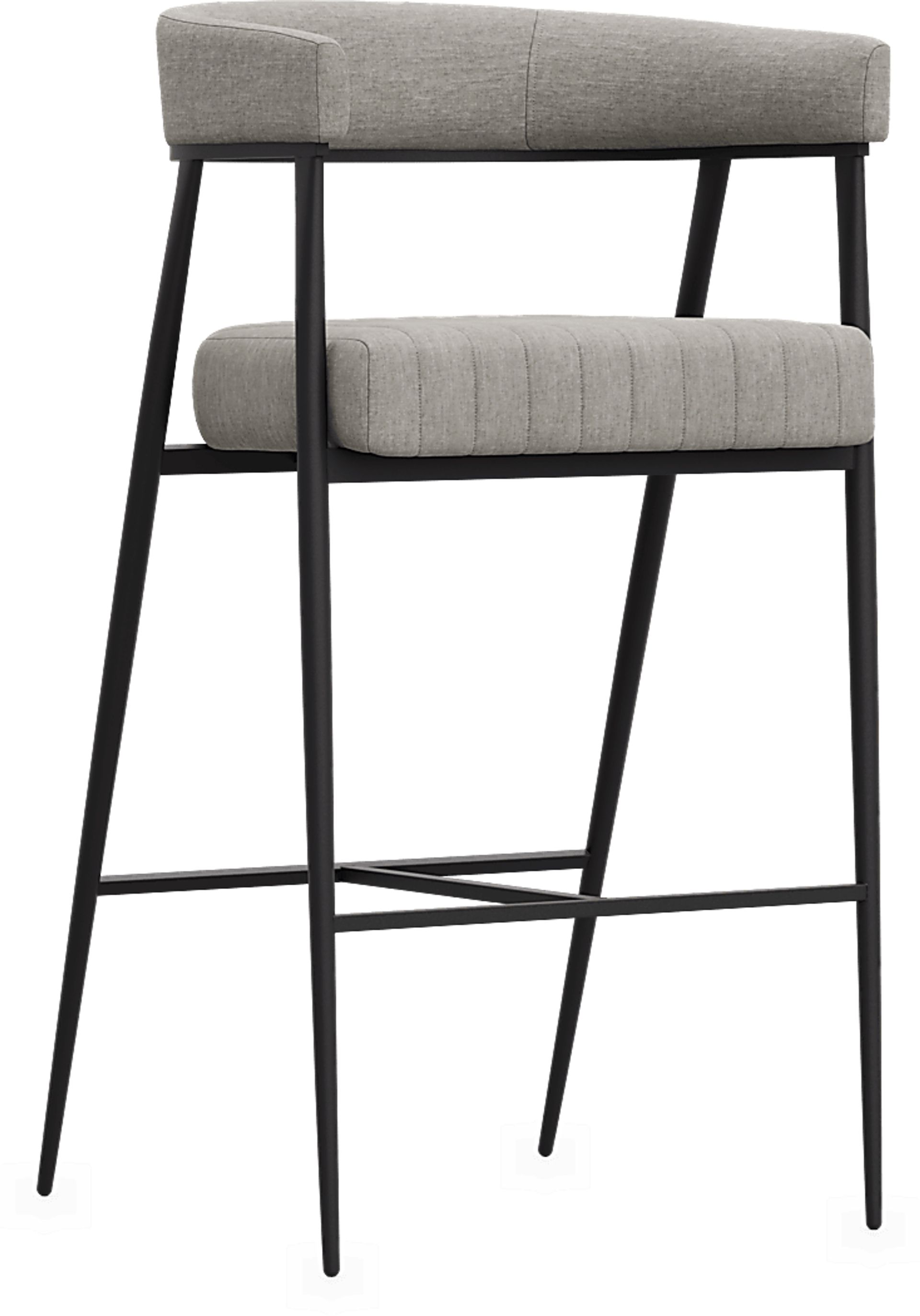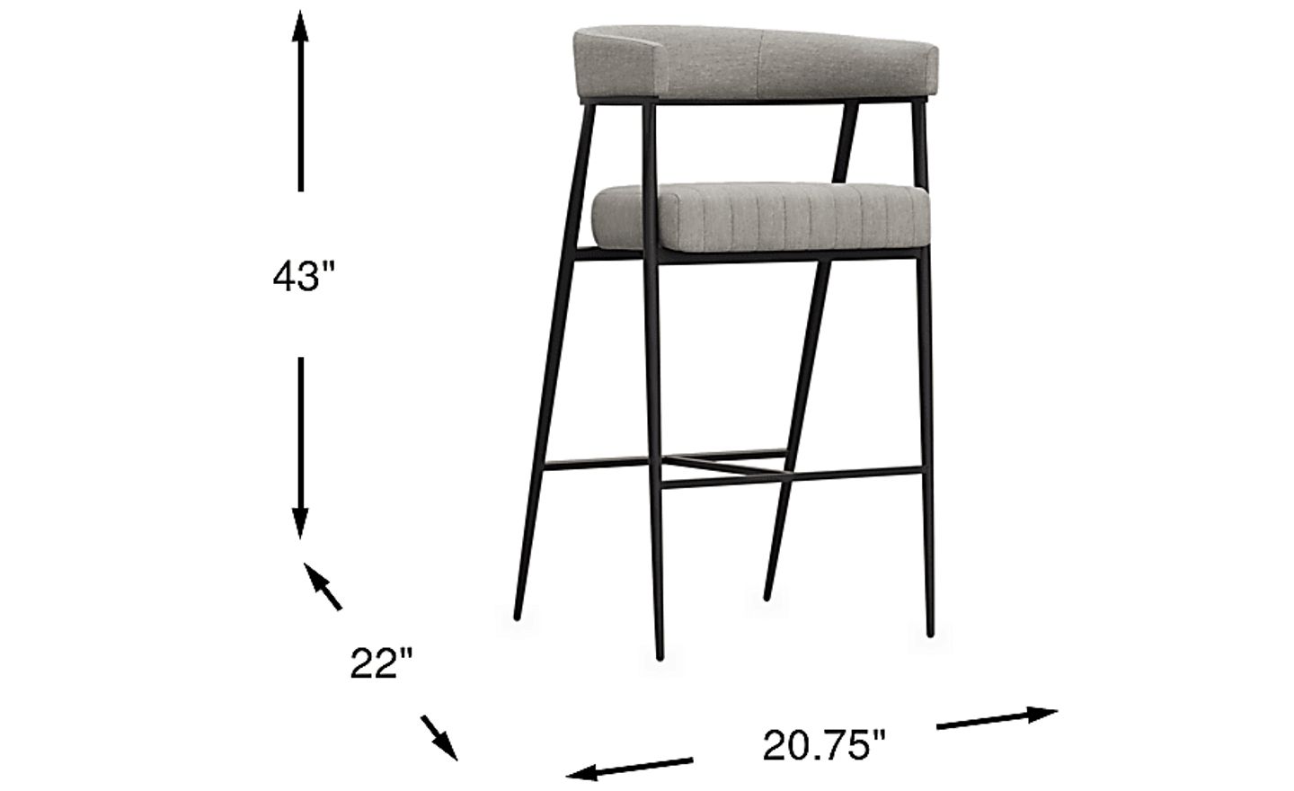 Leaning into cocktail-hour conversations or indulging in at-home relaxation, the Mathis stool is midcentury-inspired contemporary style rendered in graceful metal and soft gray fabric. Four metal legs in black each taper to a point, held steady with stretchers that conveniently function as footrests. The upholstered seat features a wrap-around back and channeled details, providing a touch of softness for those conversations that run long into the night.