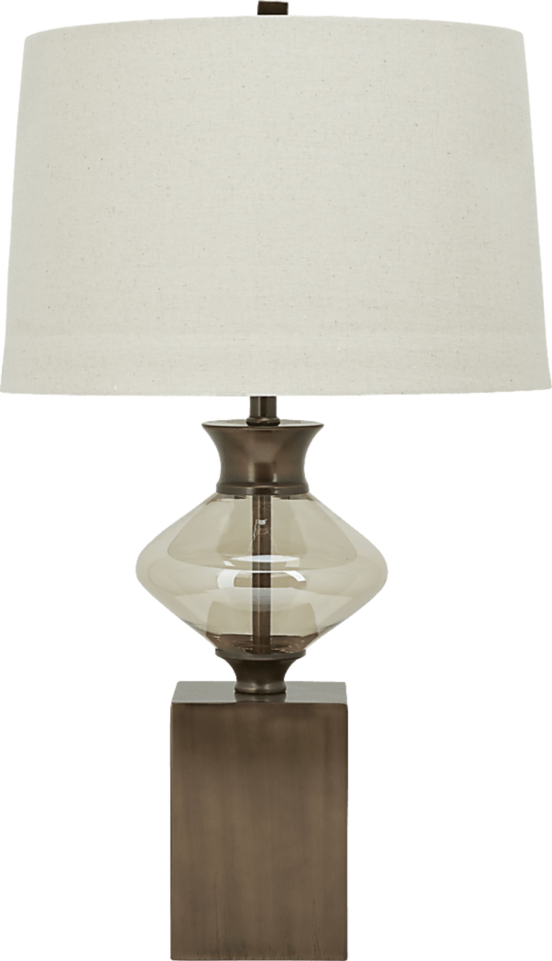 Mixed materials and a variety of shapes make the Mattu lamp a stylish choice for your lighting needs. This decorative table lamp features amber colored glass and antique copper finished metal on a contemporary block base. The lamp has a three-way switch and accommodates a maximum 150 watt bulb (not included). An ivory colored drum style shades adds the perfect topper.