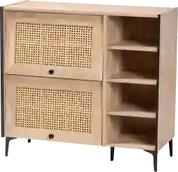 Refresh your entryway with the versatility and poise of the Mautzy brown storage cabinet. This mid-century inspired piece consists of a sturdy wood frame supported by metal legs. Four open shelves combine with four additional shelves behind the flipper doors to accommodate roughly 12 pairs of shoes, depending on size. The Mautzy features woven rattan embellishments for an added touch of classic charm. Customer assembly is required.