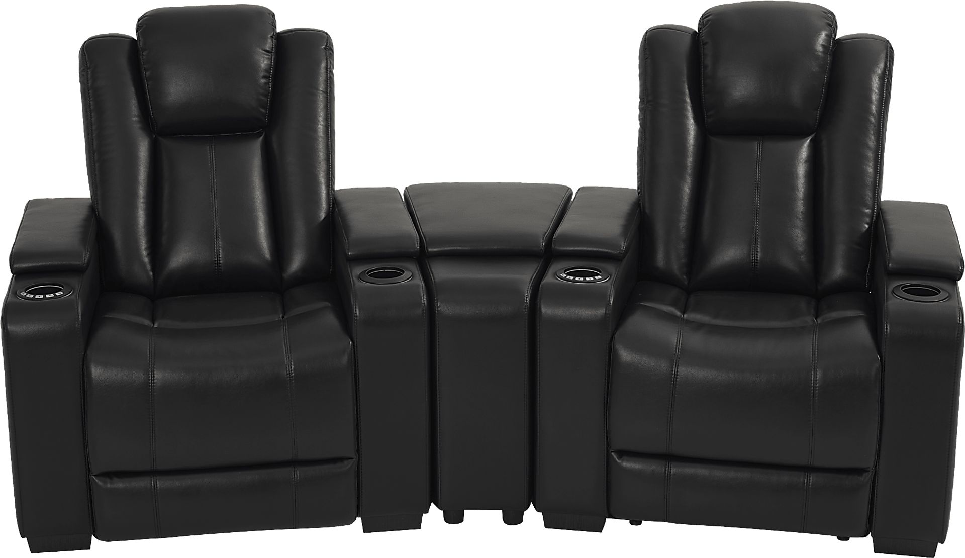 State-of-the-art movie theater seats turn any room into your favorite entertainment center with the dual power Maverick home theater sectional, the perfect combination of indulgent comfort and modern high-tech features. This traditional sectional is upholstered in durable, silky-smooth black fabric with ultra plush cushions for exceptional support. Its low-profile track arms include cupholders and hidden storage compartments for easy access to home entertainment essentials, while between each seat are media consoles with even more storage compartments. Encircling the cupholders are USB ports for convenient charging and control panels for dual power reclining, which also features zero gravity adjustable headrests and footrests. LED lighting lines the base of the sectional and cupholders for a true theater-style experience. Two dual power recliners and console wedge. Upholstery: 100% Polyurethane.