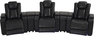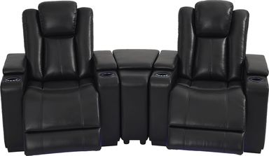 State-of-the-art movie theater seats turn any room into your favorite entertainment center with the dual power Maverick home theater sectional, the perfect combination of indulgent comfort and modern high-tech features. This traditional sectional is upholstered in durable, silky-smooth black fabric with ultra plush cushions for exceptional support. Its low-profile track arms include cupholders and hidden storage compartments for easy access to home entertainment essentials, while between each seat are media consoles with even more storage compartments. Encircling the cupholders are USB ports for convenient charging and control panels for dual power reclining, which also features zero gravity adjustable headrests and footrests. LED lighting lines the base of the sectional and cupholders for a true theater-style experience. Two dual power recliners and console wedge. Upholstery: 100% Polyurethane.