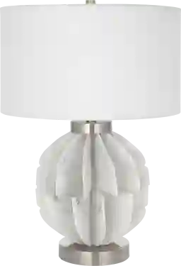The contemporary Maverick Island lamp features thin stacked blades that create an organic sphere finished in a white marble look accented by plated brushed nickel accents. The lamp is paired with a white fabric drum shade. Partial assembly may be required.