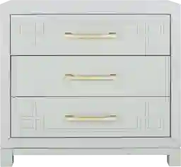 Inspired by art deco style, this vibrant 3-drawer accent cabinet makes a bold statement in any living room. Crafted with pine, it features striking carved details and a smooth grey finish highlighted by deluxe gold-finished hardware. A modern heirloom. Customer assembly is required.