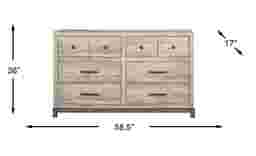 This dresser features a functional six-drawer configuration, making it an ideal choice for organizing a full wardrobe. With a width of 58.5 inches and a height of 36 inches, it offers a generous top surface for a mirror or television while providing deep internal storage suited for bulkier items like denim and sweaters.