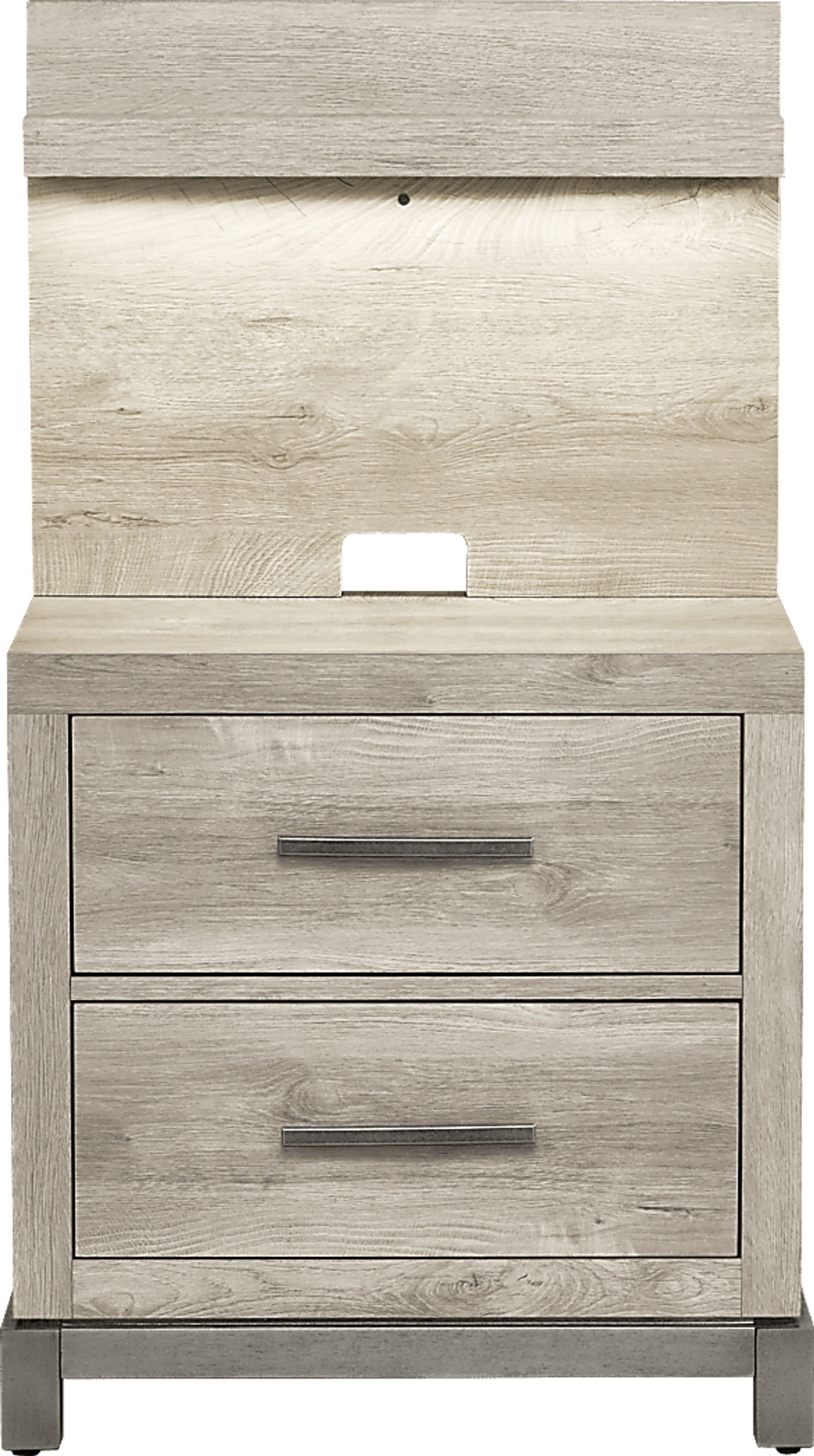 Fall in love with the warm serenity and calming rhythms of Maxton Place's clean lines and neutral palette. Crafted in a charming gray hue, this contemporary collection features a mix of textures and tones. This piece offers a glimmer of edginess with a metallic base and industrial-inspired hardware that gives both drawer faces an extra dash of pizazz. A pier extends up for a dramatic vertical element and includes LED lighting that makes bedtime more comfortable. Drawers feature front and back English dovetailing and undermounted metal glides for enhanced durability.