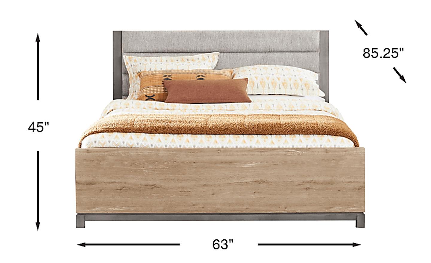 Fall in love with the warm serenity and calming rhythms of Maxton Place's clean lines and neutral palette. Crafted with hardwood solids in a charming natural hue, this contemporary bed features a mix of textures and materials. The headboard's finely detailed soft gray fabric upholstery with horizontal channeling provides a tantalizing visual contrast when juxtaposed with the industrial-inspired flair of the painted metallic finish on the posts and base of the piece. Mattress and foundation (if required) sold separately.