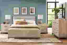 Fall in love with the warm serenity and calming rhythms of Maxton Place's clean lines and neutral palette. Crafted in a charming natural hue, this contemporary bedroom features a mix of textures and materials. The headboard's upholstery is finely detailed with soft gray fabric and horizontal channeling that provides a tantalizing visual contrast when juxtaposed with the painted metallic finish on the posts and base. The matching dresser offers a glimmer of edginess with industrial-inspired hardware that gives the piece's drawers an extra dash of pizazz. Each drawer features front and back English dovetailing and undermounted metal glides for enhanced durability. The room wouldn't be complete though without the rectangular mirror featuring framed glass in a landscape orientation. Mattress and foundation (if required) sold separately. Bed shown is queen size.