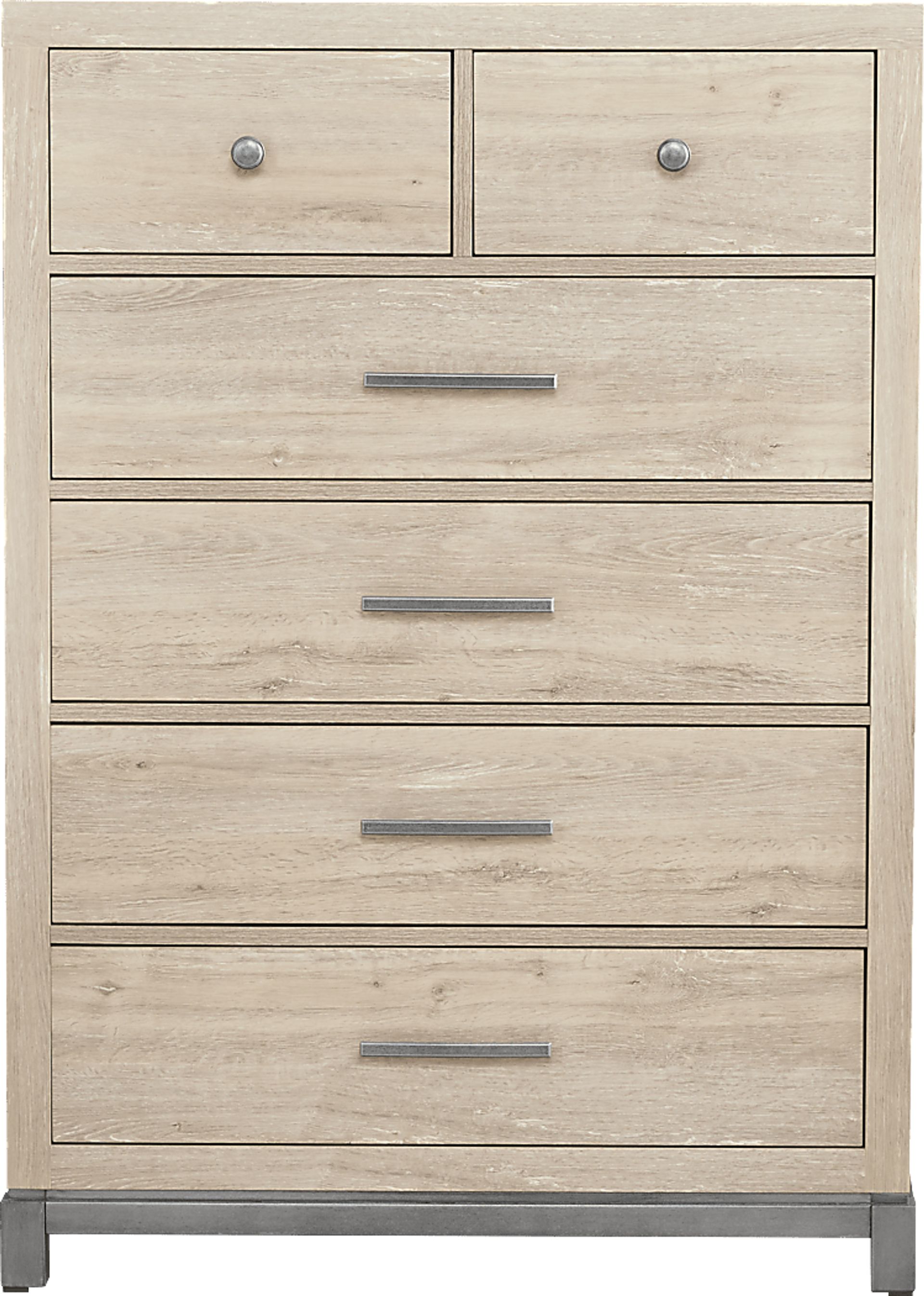 Fall in love with the warm serenity and calming rhythms of Maxton Place's clean lines and neutral palette. Crafted in a charming natural hue, this contemporary collection features a mix of textures and tones. This piece offers a glimmer of edginess with a metallic base and industrial-inspired hardware that gives all five drawer faces an extra dash of pizazz. Drawers feature front and back English dovetailing and undermounted metal glides for enhanced durability.