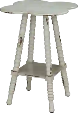 The Maybelle Lane is a white washed accent table in a clover shape, perfect for any room! Some assembly required.