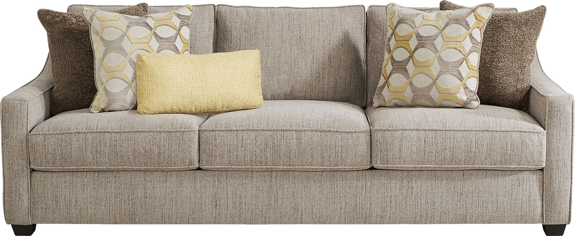 Graceful, chic, and altogether charming, the Maywell Court sofa brings understated class into any room it's in. Transitional in style, the brown woven upholstery perfectly complements the sophisticated track arm curves while three loose seat cushions and back cushions provide easy cleaning and enhanced longevity. Padded outside arms and backs add both softness and solidity, while tapered legs with black finish showcase a provocative contrast. Accent pillows add a light touch and visual contouring for style and depth. Upholstery: 100% Polyester.