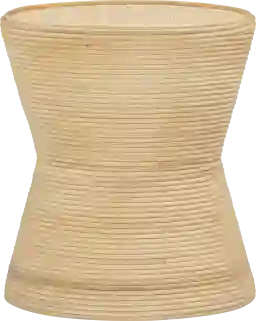 The Mazebit natural end table brings natural texture with its woven rattan top and sculptural hourglass silhouette. Fully wrapped in rattan, this piece adds an organic touch with a bold edge.